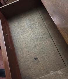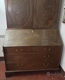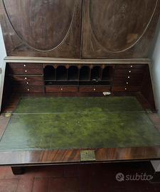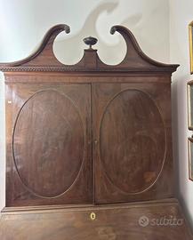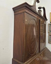 Prestigioso Secretaire con alzata di epoca Giorgio III (fine '700/inizio '800) in stile Hepplewhite. Realizzato in piuma di mogano con interni dei cassetti in rovere di alta qualità. Parte superiore: Elegante cimasa a "collo di cigno" e ante con decori ovali intarsiati. Scrittoio: Ribalta con interno architettonico (cassettini e vani) e piano in pelle verde. Base: Tre grandi cassetti con maniglie originali e piedi a staffa. Il mobile è strutturalmente sano e in prima patina. Presenta i naturali segni del tempo che ne garantiscono l'autenticità. Divisibile in due corpi per il trasporto. Dimensioni altezza 237cm larghezza 135cm profondità 66cm