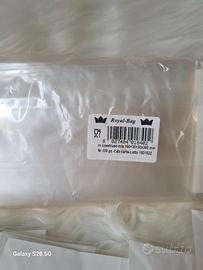 Buste per uso alimentare, trasparenti in plastica con fondo rettangolare in carta.