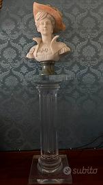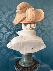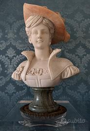 Raffinatissima scultura d’epoca, autentico capolavoro dello stile Eclettico/Neorinascimentale risalente alla fine del XIX / inizio del XX secolo. L’opera ritrae una nobildonna dal volto ideale, caratterizzata da un'eleganza senza tempo. Caratteristiche di pregio: • Materiali Preziosi: La scultura è realizzata con una sapiente combinazione di marmi policromi. Il candido marmo bianco statuario del volto contrasta magnificamente con l'alabastro rosato/ambrato del sontuoso cappello piumato. • Dettagli Magistrali: Di incredibile fattura la resa del colletto alto ricamato, dei fiori applicati sulla veste e della complessa acconciatura. Ogni dettaglio è scolpito con estrema minuzia. • Dimensioni Importanti: Altezza 60 cm, larghezza spalle 42 cm. Una presenza scenica monumentale, ideale per saloni di rappresentanza, studi professionali o collezioni private di alto livello. • Basamento: Poggia su un elegante piedistallo in marmo Verde Alpi, che ne slancia la figura e conferisce ulteriore stabilità e valore. Stato di Conservazione: L’opera si presenta in condizioni eccellenti, perfettamente conservata in ogni sua parte fragile (piume, fiori e dita), senza restauri evidenti o rotture. La Colonna: Inclusa nell'offerta, una colonna in plexiglas trasparente di alta qualità, studiata appositamente per esaltare la scultura senza appesantire l'ambiente. • Dimensioni Colonna: Base 35x35 cm, Altezza 88 cm. • Effetto Visivo: La trasparenza del plexiglas fa apparire il busto come "sospeso", rendendolo il punto focale assoluto di qualsiasi stanza. Note: • Dimensioni busto: 60 x 42 cm (spalle) • Epoca: Fine '800 / Inizio '900. • Ritiro: Data la fragilità e il peso dell'opera, si predilige il ritiro a mano zona Roma Est. • L'opera montata sulla colonna raggiunge un’altezza complessiva di circa 148 cm. Un pezzo raro che unisce l'investimento artistico al massimo valore estetico. – Trattativa riservata per collezionisti seri.