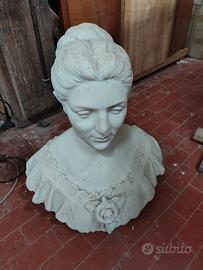 Elegante scultura a mezzo busto in marmo bianco, raffigurante una nobildonna dell'alta società italiana o europea della fine dell'Ottocento. L'opera è un eccellente esempio di ritrattistica neoclassica/romantica, caratterizzata da un'incredibile cura per i dettagli tessili e floreali. Dettagli Scolpiti: La figura indossa un abito scollato con un ampio colletto finemente lavorato a motivi floreali (margherite). Al centro del petto spicca una rosa in pieno bocciolo, scolpita con grande realismo. Acconciatura e Tratti: Il volto presenta lineamenti sereni e nobili, con i capelli raccolti in una pettinatura elaborata tipica della moda dell'epoca. Materiale: Marmo bianco a grana fine (presumibilmente di Carrara), che conferisce alla scultura una luminosità naturale. Condizioni: Il busto è integro e conserva una splendida patina originale. Si segnala una sbeccatura sulla punta del naso e lievi segni del tempo che ne attestano l'originalità e il fascino storico. dimensioni reali 1:1