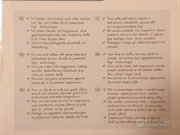 Allo stesso tempo elimina le sostanze in grado di alterare odore e gusto (come ad es. il cloro). La cartuccia filtrante fornisce protezione anticalcare e acqua mineralizzata al magnesio, rendendo l'acqua filtrata dalla caraffa, la scelta perfetta per i buongustai e gli intenditori, anche per la preparazione di tè e caffè.