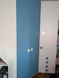 i vari moduli misurano 90 la prima parte bianca +70 la porta azzurra +60 la parte con i cassetti +30 la libreria.