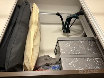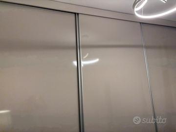 Cabina armadio a tre ante scorrevoli color tortora lucido con finiture acciaio satinato . Completamente attrezzata con tre cassettiere De Rossi, 3 aste appendi abiti , 8 mensole. Misure : 3 Mt altezza. , ogni anta è larga 1,33 quindi è larga in totale 4 metri.