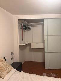 Cabina armadio peronalizzabile con tante funzionalità,ad angolo, ingombro (120x300)con ante scorrevoli in vetro temperato bianco opaco(150x270)