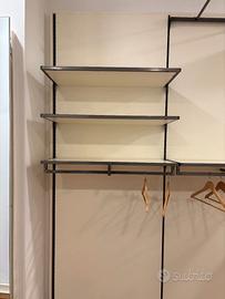 Cabina armadio in mdf laccato con cornice laccata opaca e due fasce laterali laccate opache. 3 sezioni, di cui due con 2 mensole appendiabiti e ripiano di appoggio, la centrale con asta più appendiabiti frontale e mensola con appendiabiti.