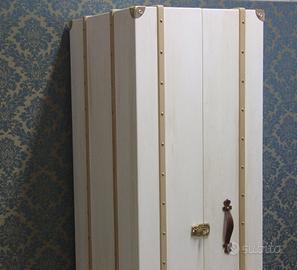 Baule armadio in legno fatto a mano da artigiano - Maniglie in ottone, Maniglia esterna in pelle, lavorazione interna dipinta a mano, specchio e cassettini con colore interno dipinto color tortora - Misure Baule armadio chiuso cm60x50hcm155 - Misure Baule armadio aperto cm120 prof.25 Hcm155