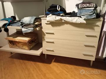 E' componibile , con mensole, barre appendiabiti e cassettiera centrale. Design moderno, capiente e funzionale.