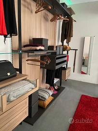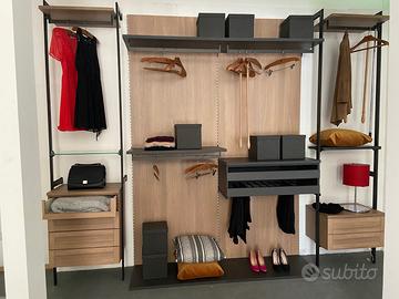 Elementi componibili per cabina armadio in laminato grigio ed effetto legno. 320x48p.x258h. Gli elementi sono 4 e possono essere distribuiti diversamente dalla foto, sono posizionabili anche ad angolo. Prodotto da esposizione visionabile in negozio telefonando per appuntamento. Trasporto escluso dal prezzo ma concordabile.