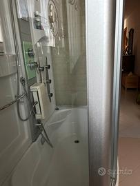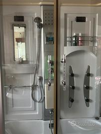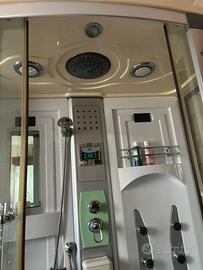 Cabina doccia con vasca ,seduta laterale mensole diccione a soffitto doccino staccabile luci interne ed esterne porte scorrevoli ricezioni radio