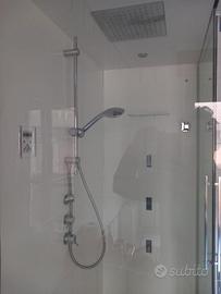 Cabina doccia perfettamente funzionante dotata di cromoterapia, radio, colonna doccia integrata nel soffitto, soffione doccia ed idromassaggio integrato. Cambio per variate esigenze d'utilizzo. Il basamento è stato sollevato per mostrare lo scarico sottostante. Vendo completa di ogni accessorio che la compone.