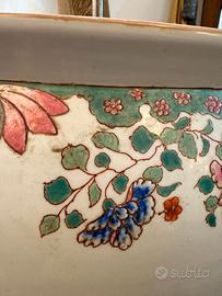 •Stato: Presenta segni d'uso coerenti con l'utilizzo come portavaso; alcune usure superficiali visibili, particolarmente sul bordo; piccole imperfezioni e craquelure presenti