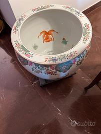 Importante cachepot (o acquario) cinese in porcellana con ricca decorazione policroma della famiglia rosa. Il pezzo presenta un elaborato decoro di rami fioriti con peonie, crisantemi e altri motivi botanici, accompagnati da delicate farfalle. Il bordo superiore è ornato da una fascia decorativa che combina motivi geometrici e ghirlande floreali nella caratteristica palette della famiglia rosa: rosa, verde, blu e rosso ferro su fondo bianco.