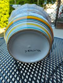 Vaso / cachepot decorativo in ceramica stile Deruta, dipinto a mano. Decorazione molto bella e vivace, ideale come portavaso o elemento d’arredo. Condizioni: buone nel complesso, ma presente una sbeccatura sul bordo, ben visibile in foto. Per il resto l’oggetto è integro e fa comunque una bella figura da esporre. Scritta sul fondo: Deruta. Venduto come oggetto decorativo da collezione/arredo, con formula visto e piaciuto.