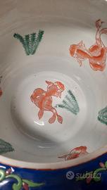 Bellissimo acquario in porcellana di manifattura cinese, risalente al XX secolo. Presenta una decorazione floreale vivace su sfondo blu. Misure: diametro 35 cm, altezza 27 cm Realizzato in porcellana pregiata, presenta dipinti a mano raffiguranti carpe koi e motivi floreali, tipicamente su sfondo blu. - Decorazioni floreali e farfalle.