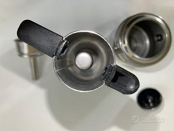 Caffettiera Manhattan o ManHAttan, di Goffredo Reggiani, anni '70, mai usata, ancora con etichetta adesiva sul corpo. Altezza 21cm, da 2 tazze, in inox, peso 340 grammi.