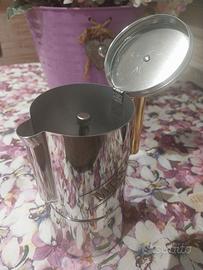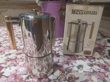 Elegantissima caffettiera da 6 tazze della nota marca di caffè (...LAVAZZA...) con il nome di MISS lavazza ....completamente in acciaio lucidata a specchio e con il pomolo ed il manico placcato in oro è davvero davvero elegantissima nuova di fabbrica è in vendita a 70 euro