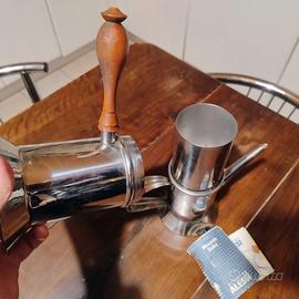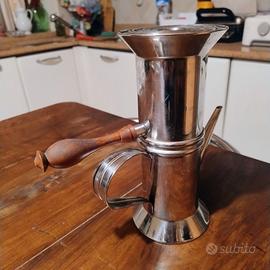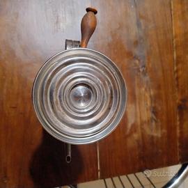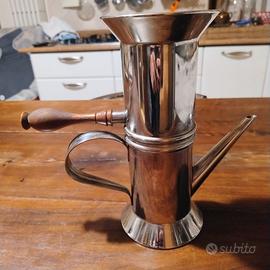 In acciaio lucido con manico e pomolo in legno di noce. Denominata "Cuccumella"