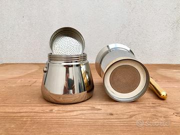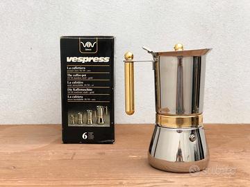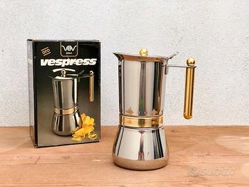 Caffettiera acciaio inox 18/10 “Vespress” con finiture dorate. È un prodotto vintage, realizzato dalla Vev Vigano, un noto marchio italiano di caffettiere in acciaio.
