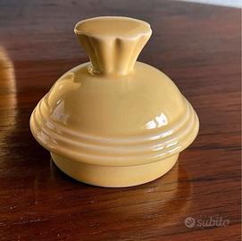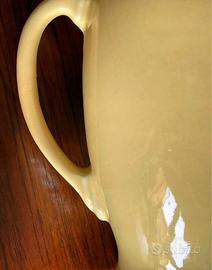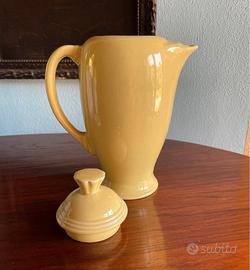 Caffettiera gialla vintage della Homer Laughlin China Co. con la scritta "HLC Fiesta USA" sul fondo, prodotta negli Stati Uniti intorno agli anni '80. È in ottime condizioni e non presenta rotture. Dalla forma particolare, è alta 23 cm con il coperchio, 19 cm senza e 19 cm di larghezza compreso il manico. Può essere utilizzata anche per servire il tè o come caraffa per bevande o acqua. #homerlaughlin #hlcfiestaware #vintagecoffee #vintageteapot #yellow #yellowceramic #madeinusa #80s