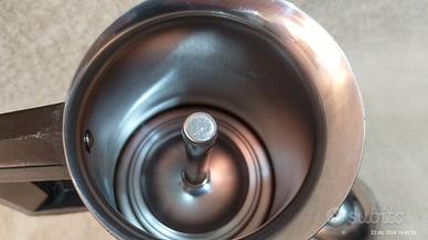 Capacità 6/8 tazze, realizzata interamente in acciaio inox 18/10 con impugnatura e pomolo superiore in bachelite nera.