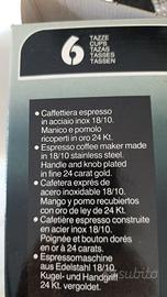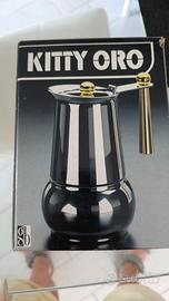 Caffettiera italiana vintage,mai usata in ottime condizioni, per 6 tazze, prodotta e disegnata negli anni '80 dall'azienda italiana G.B. di Guido Bergna, azienda assorbita da Bialetti nel 2001. Si tratta del modello "Kitty oro", realizzata interamente in puro acciaio inossidabile 18/10 e manico e pomolo bagnati in oro 24kt. Solida e robusta, è marchiata sul fondo "GB - MADE IN ITALY - acc. INOX 18-10". Perfettamente funzionante.Per maggiori informazioni o foto, contattatemi.
