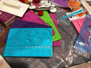 Diversi tipi di stampi, attrezzi e accessori per il cake design alcuni ancora imballati.