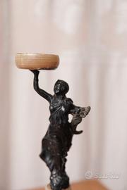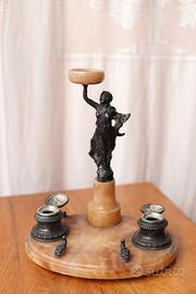 Antico calamaio in metallo raffigurante statua di donna, su base in alabastro arancione, con portapenne.