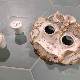 Calamaio in porcellana antico bianco con fregi dorati completo di due boccette. Il coperchio della boccetta dell'inchiostro è mancante del pomellino di impugnatura. Stefania 3473732923