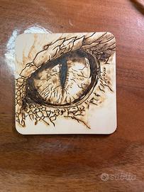 Calamita decorativa realizzata interamente a mano su legno naturale recuperato e lavorato da me, con incisione pirografata dettagliata raffigurante un intenso occhio di drago. Ogni pezzo è unico e irripetibile.