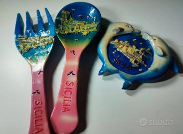 calamita da frigorifero a forma di Sicilia.È un souvenir tipico che raffigura l'isola con alcuni dei suoi elementi distintivi.