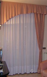 Realizzate in ottimo tessuto broccato misto seta color rosa scuro. H2,63 x 0,60 il laterale e circa 2mt la mantovana
