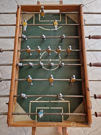 Vendo un affascinante calcio balilla vintage da tavolo, un pezzo d'epoca che porta con sé il calore dei giochi di un tempo. Risalente probabilmente agli anni '50 o '60, questo calcio balilla ha una struttura in legno con piedi pieghevoli, che lo rende facile da riporre e da trasportare.