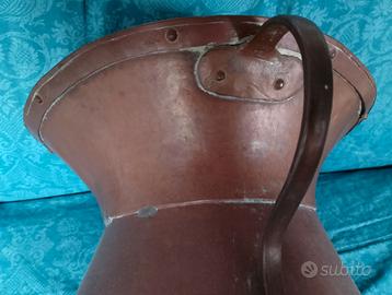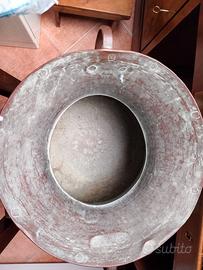Autentico set antico in rame battuto/martellato a mano. Il set è composto da: 1) Grande Caldaia (paiolo/conca), caratterizzata da una forma svasata con ampie maniglie laterali in rame rinforzato; interno stagnato (segni del tempo visibili attestanti l'originalità). 2) mestoli (coppi/sassole) di diverse dimensioni, realizzati in rame con manici lunghi e gancio finale per essere appesi al bordo della conca. Caratteristiche: rame massiccio con finitura artigianale in stile arte povera/tradizione contadina italiana. Misure: diametro superiore della conca cm 35, altezza cm 30.