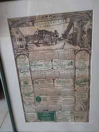 Calendario vintage del 1990 per Woodstock, Vermont. Include illustrazioni dettagliate della città e delle sue attività commerciali.