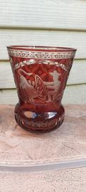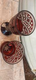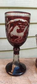 eleganti bicchieri in vetro rosso rubino inciso a mano probabilmente cristallo di Boemia, bicchiere a calice più alto con stelo a piede ampio, l' altro più basso e robusto usato per liquore o acqua. Le superfici presentano motivi geometrici e di caccia tipici della tradizione del XX secolo