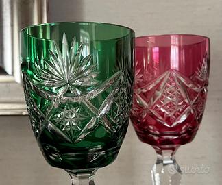 Vendesi splendida coppia di calici vintage in pregiato cristallo incamiciato e molato a mano. I bicchieri si presentano in due colorazioni classiche e intense: Verde Smeraldo e Rosso Rubino.