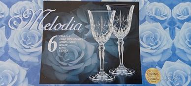 vendo Set 18 calici Cristal melodia mai usati ottimo stato con scatola originale per vino, acqua e spumante.