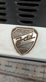 Calorifero/stufa a combustibile, vintage, a corpo unico. La struttura principale è di colore bianco smaltato con dettagli superiori e laterali in nero lucido. Il frontale presenta un marchio ovale con la scritta "CALORIFERO Fai BRESCIA". Sotto il marchio si trova una manopola o indicatore con una forma a freccia. La parte superiore è dotata di griglie per l'emissione del calore. È un oggetto d'epoca che necessiterebbe di un'attenta verifica del funzionamento e della sicurezza per un utilizzo come fonte di calore.