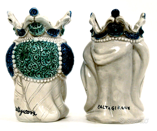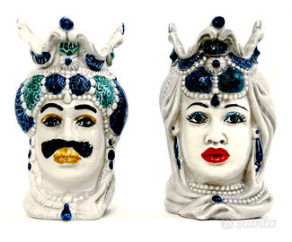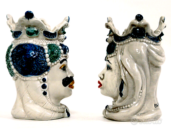 eccellente coppia di testa di moro Ceramiche Caltagirone realizzate e dipinte interamente a mano (le possibili imperfezioni sono garanzia di prodotto artigianale) su toni blu /verde da utilizzare come soprammobile o porta piante le teste sono di dimensioni 13x8 con diametro vaso cm 12 (piccole variazioni sono a tutela di prodotto artigianale)