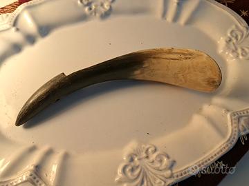 Elegante oggetto d'artigianato vintage realizzato interamente in vero corno lavorato a mano. L'oggetto si distingue per le splendide sfumature naturali che variano dal nero intenso della punta al color miele/venato della parte più ampia.