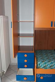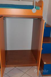 - 1 alto armadio al di sopra dei 4 cassettini, suddiviso in 3 scompartimenti, che presenta 3 ripiani e 1 appendi-abiti;