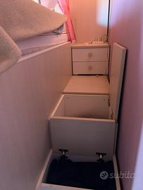 Camera a ponte con letto singolo sopra e letto da una piazza e mezza sotto(largo 128 cm), armadio a due ante alto e capiente,gradini contenitori e comodino. Di qualita’ e perfetta . Smontaggio a breve quindi consegnamo già smontata con parti numerate per un facile montaggio.