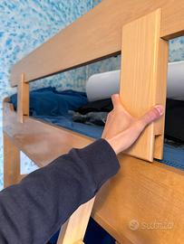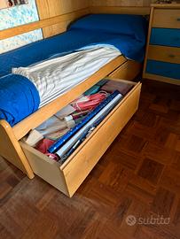 Camera a soppalco, con cassettoni, armadio, mensole e comó con cassetti. Legno massello. Tenuta benissimo.