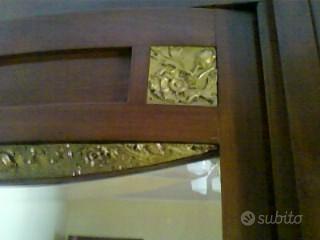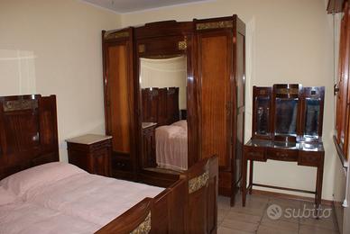 Vendesi camera da letto, stupenda, periodo primo novecento, composta da Un armadio con 3 ante,2 cassetti e con un grandissimo specchio , 1 comò con piane in marmo nero , 1 un letto Matrimoniale con testate divisibili, con inserti in ottone.