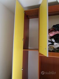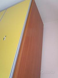 camera armadio a ponte in ciliegio con ante gialle da cm. 253 x prof. 57/94 x h. 262 con ....1 letto e 1 letto estraibile, con reti a doghe e materassi possibilità di consegna a domicilio