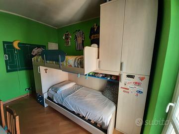 Vendesi causa inutilizzo cameretta a ponte, completa di scala a scomparti, 2 letti con doghe, 2 materassi, armadi, scrivania, mensole, tinta abete chiaro con inserti laccati blu. Misura parete totale lunghezza 3,5 m x larghezza 1,4 x altezza2,6. Scrivania+libreria 2 x 0,65 m