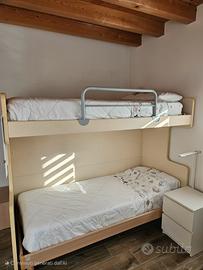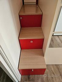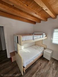 Composizione letti Moretti composta da letto rialzato con corridoio e scaletta composta da parti separate combinabili a piacere, tutte contenitive, più letto sotto che si può mettere come in foto o perpendicolarmente rispetto a quello sopra. Anche la scaletta è componibile come in foto (quindi con corridoio usato come cassapanca staccata) oppure come in soluzione B nel disegno allegato nel quale le proporzioni sono indicative.