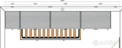 Vendo cameretta per bambini in ottime condizioni. La struttura è bianca e arancio, con le seguenti misure: lunghezza 350 cm, profondità 50 cm, altezza 260 cm. Il letto, che misura in profondità 90 cm, ha una rete estraibile posizionata sotto di esso. La vendita non include i materassi. La cameretta è già smontata, con ogni pezzo etichettato per facilitare il montaggio.