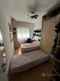 Vendo cameretta per bambini presa da mobili Elio, due letti di cui uno a scomparsa, l’altro invece è mobile grazie alle ruote poste alla base, possiede anche un comodo cassettone sottostante. Scrivania a scomparsa dietro al secondo letto. Cedo inoltre le mensole e i mobili della camera che sono posti nel ripostglio. Non vendo la scrivania bianca, la sedia e lo specchio.