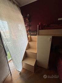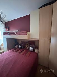 Vendo cameretta con rete matrimoniale e letto singolo con scaletta come da foto condizioni perfette, con armadio angolare , cassettiera e mobile a due ante basso. Utlizzabile per arredo camera studenti o altro